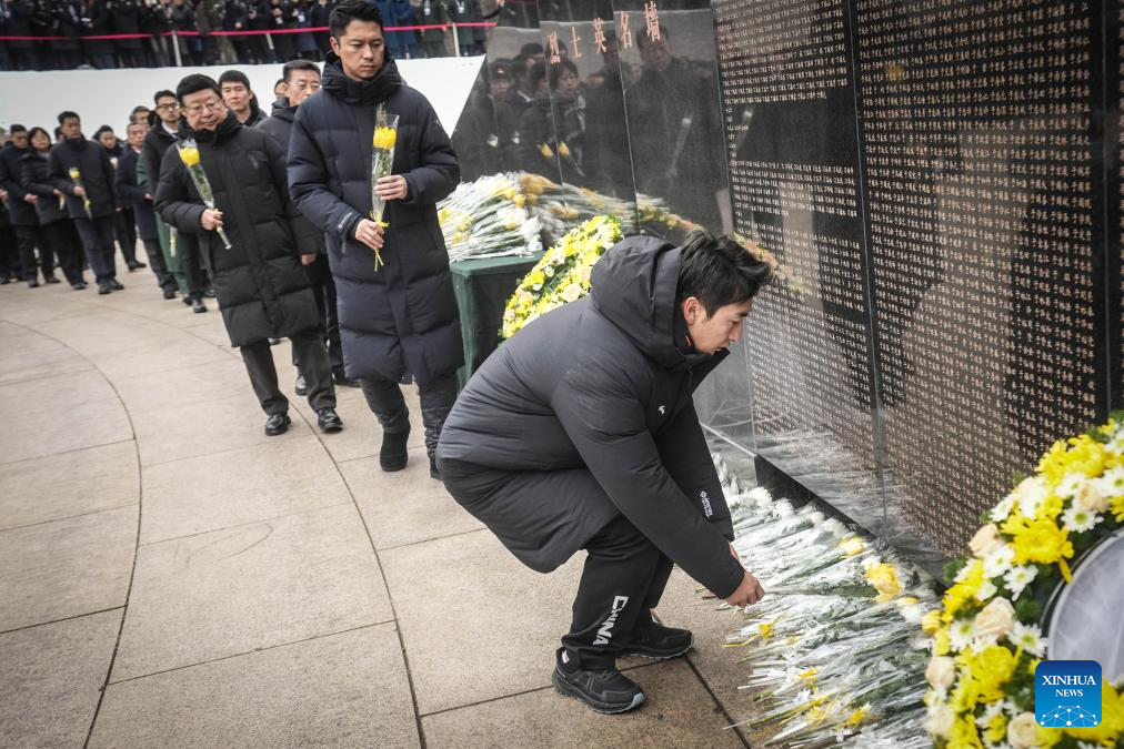People line up to present flowers to the memorial wall of Chinese People's Volunteers (CPV) martyrs at the CPV martyrs' cemetery in Shenyang, northeast China's Liaoning Province, Nov. 29, 2024. The remains of 43 Chinese People's Volunteers (CPV) soldiers who lost their lives during the War to Resist U.S. Aggression and Aid Korea (1950-1953) were laid to rest on Friday in Shenyang, capital of northeast China's Liaoning Province.
