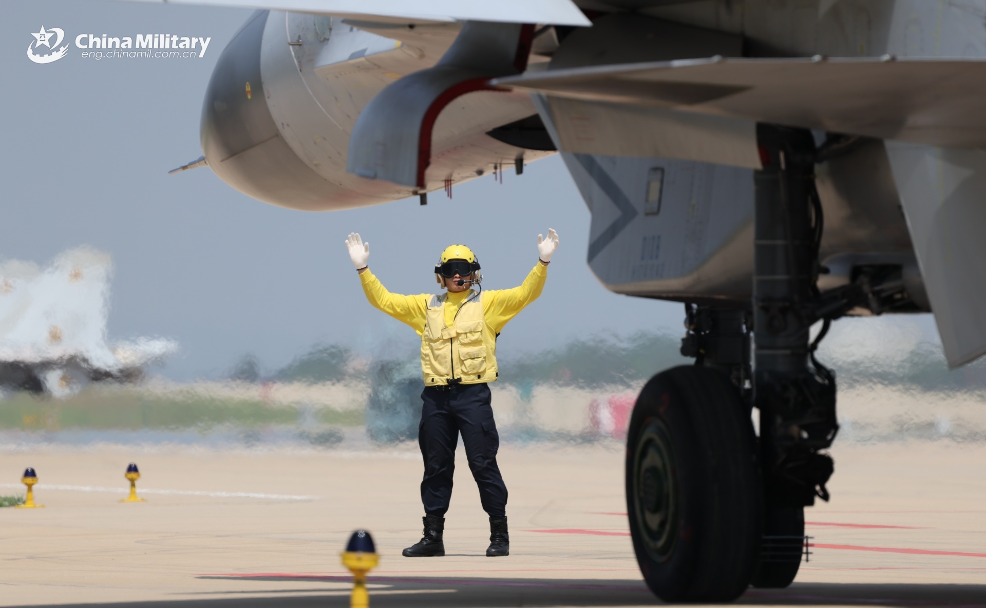 An aircraft handling officer assigned to a training base of the Chinese PLA Naval Aviation University signals a J-15 carrier-based fighter jet to move during a take-off and landing training exercise in late September, 2025. (eng.chinamil.com.cn/Photo by Jiang Tao)