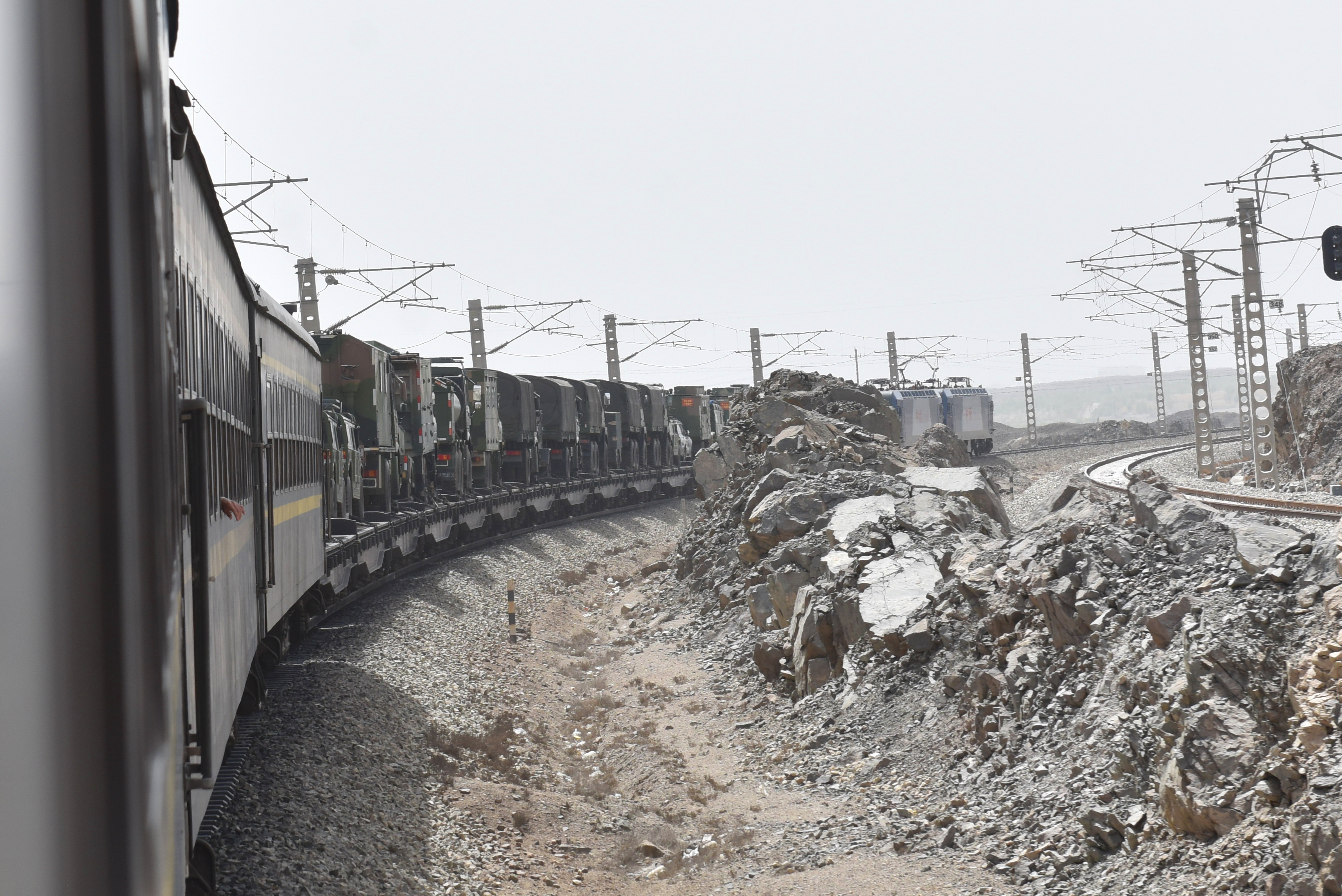 Military trucks carrying weapons and equipment are transported by rail to a designated training area in northwestern China's Gobi Desert on May 3, 2018. They are attached to an artillery brigade under the PLA 72nd Group Army. (eng.chinamil.com.cn/Photo by Peng Xianhua)