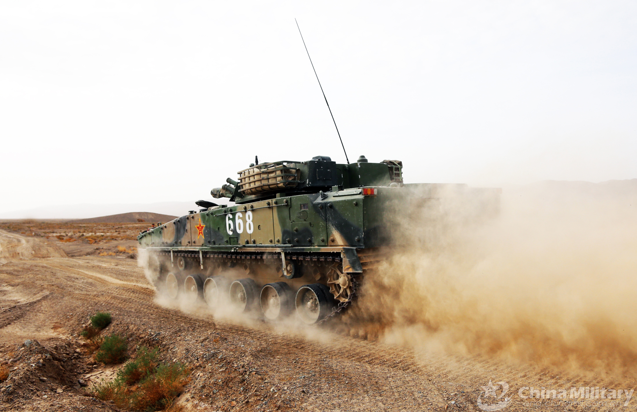 A Type-04A Infantry Fighting Vehicle (IFV) attached to a brigade under the PLA 76th Group Army rumbles on a dusty road during a military skills competition in northwestern China's Gansu Province on May 9, 2018. (eng.chinamil.com.cn/Photo by Li Zhongyuan)