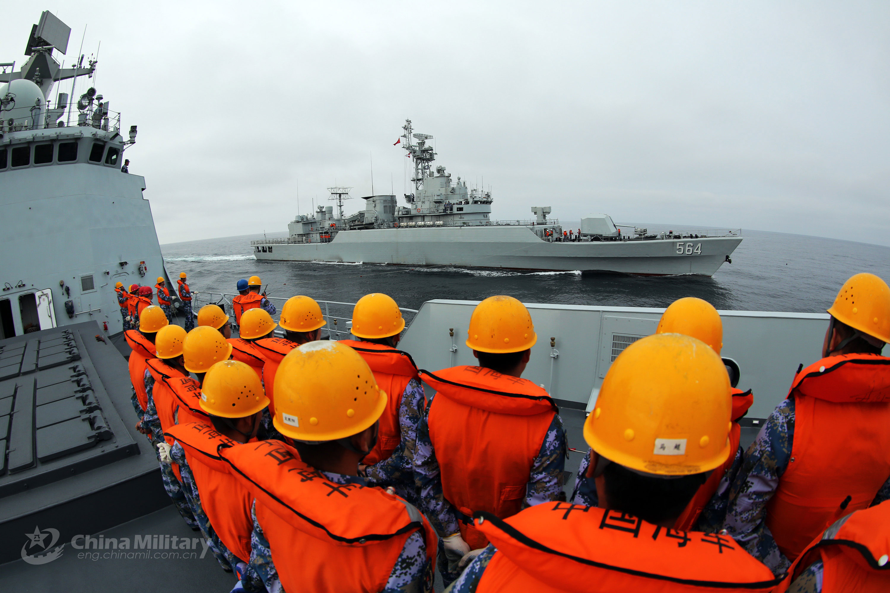 Sailors aboard the guided-missile frigate Daqing (Hull 576) prepare to conduct a replenishment-at-sea with the guided-missile frigate Yichang (Hull 564) during a maritime live-fire training exercise at an undisclosed sea area in the Yellow Sea from May 11 to 14, 2018. They are assigned to a destroyer flotilla with the navy under the PLA Northern Theater Command. (eng.chinamil.com.cn/Photo by Zhang Hailong)