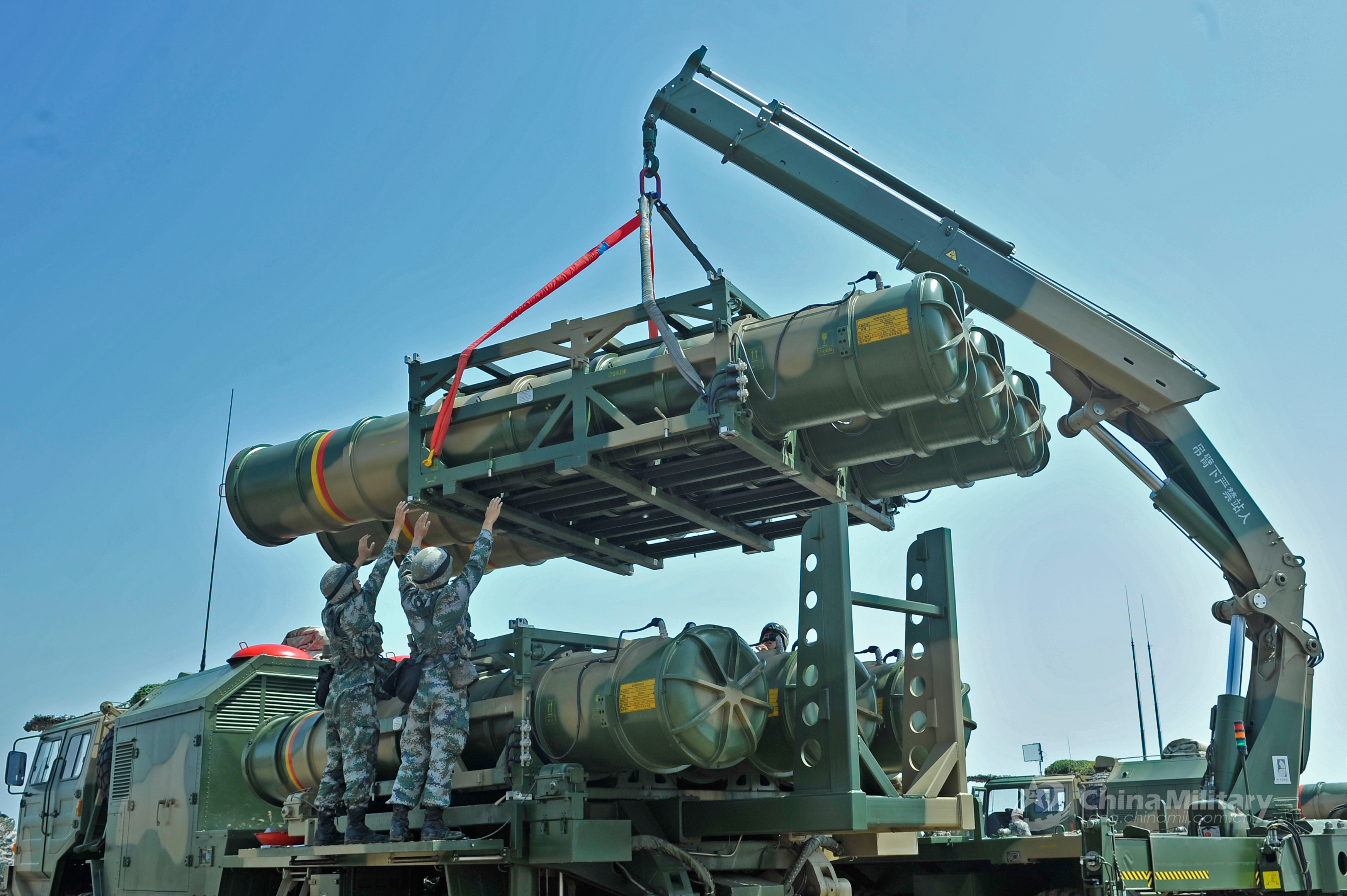 Artillerymen assigned to a brigade under the PLA 81st Group Army operate a crane to hoist and load HQ-16 medium-range air defense missiles onto the palletized load system during a field training exercise in early June, 2018. (eng.chinamil.com.cn/Photo by He Miao)