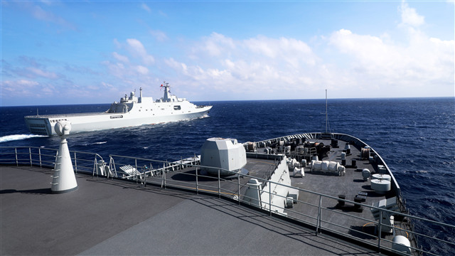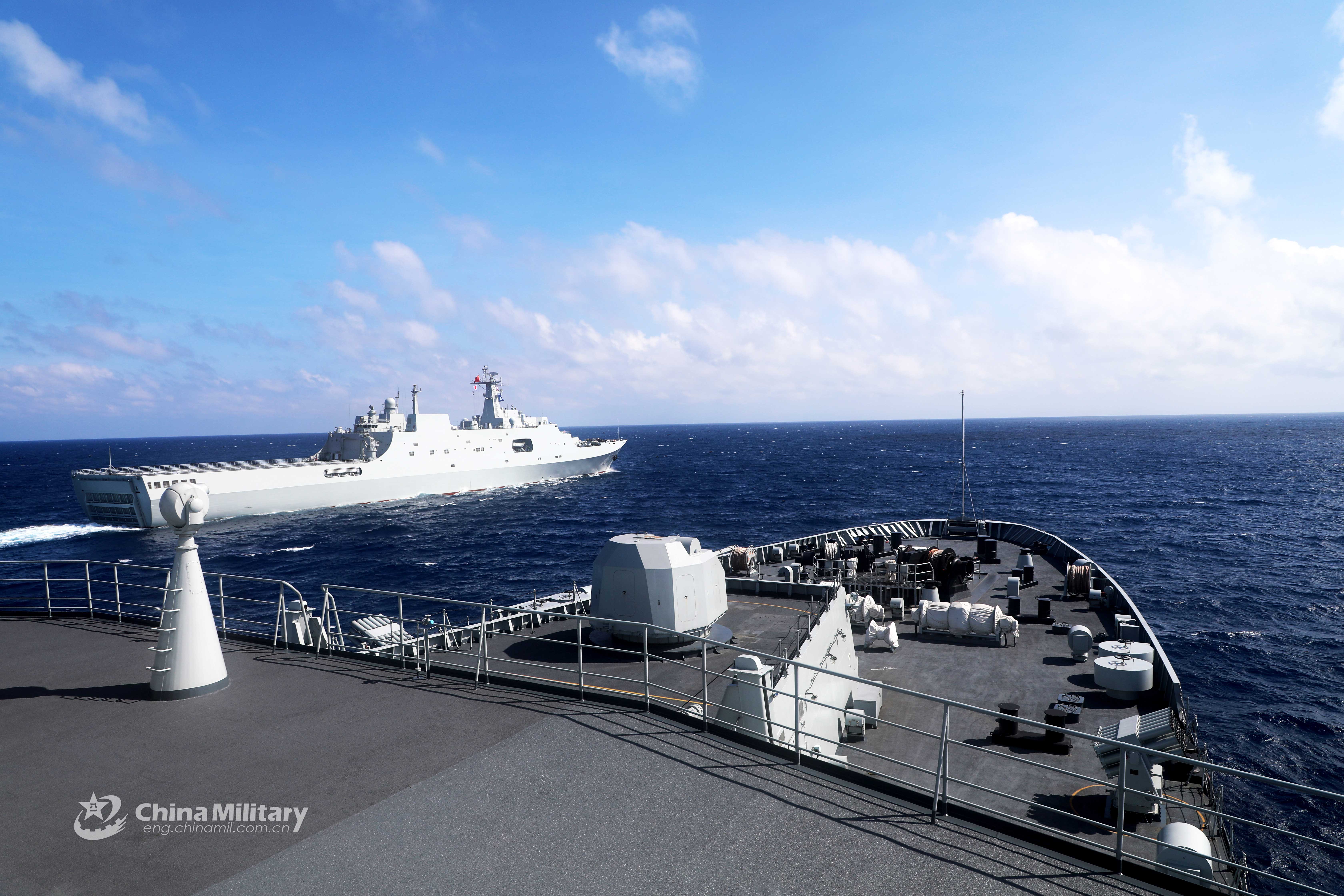 The amphibious dock landing ships Changbaishan (Hull 989, R) and Wuzhishan (Hull 987, L) attached to a landing ship flotilla with the navy under the PLA Southern Theater Command steam in formation in waters of the South China Sea during a three-dimensional amphibious landing operation from May 29 to June 3, 2019. (eng.chinamil.com.cn/Photo by Qiao Chenxi)