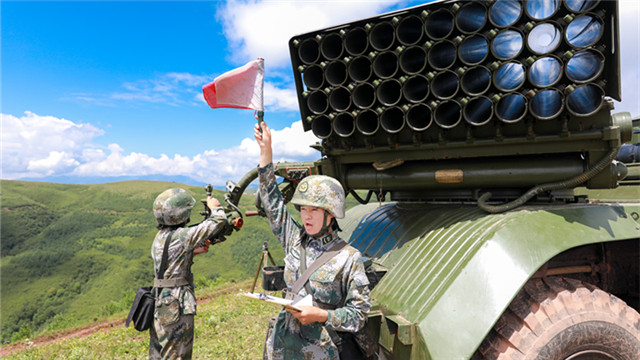 Vehicle-mounted rocket launcher systems attached to a female platoon of an artillery brigade under the PLA 77th Group Army fire rockets during a live-fire test on August 3, 2019. (eng.chinamil.com.cn/Photo by Hu Jing and Sun Zhenqi)