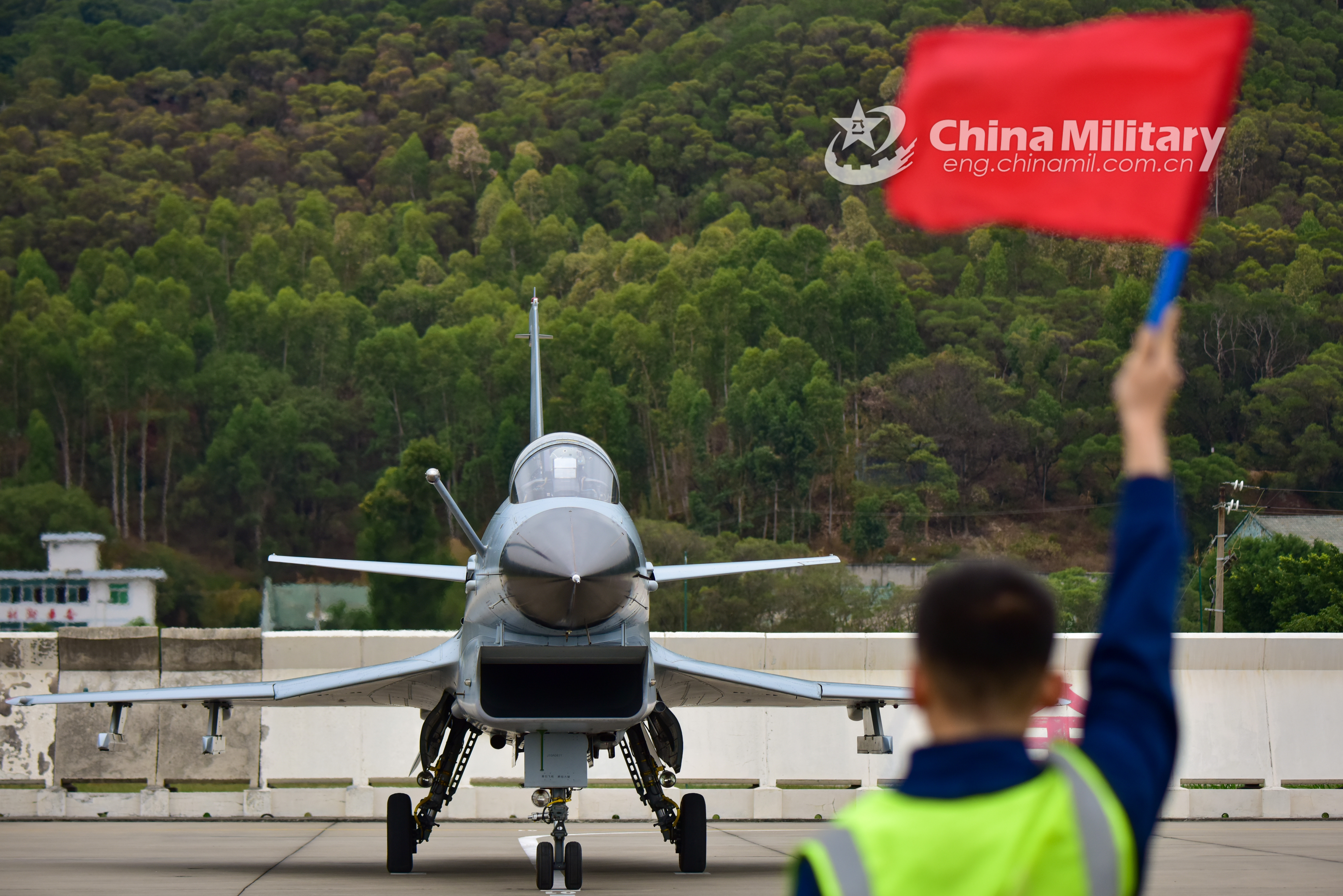 A ground crew assigned to an aviation brigade of the air force under the PLA Southern Theater Command uses flag signals to guide a J-10 fighter jet at a military airfield during an air combat flight training exercise on November 28, 2019. (eng.chinamil.com.cn/photo by Wei Jinxin)