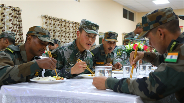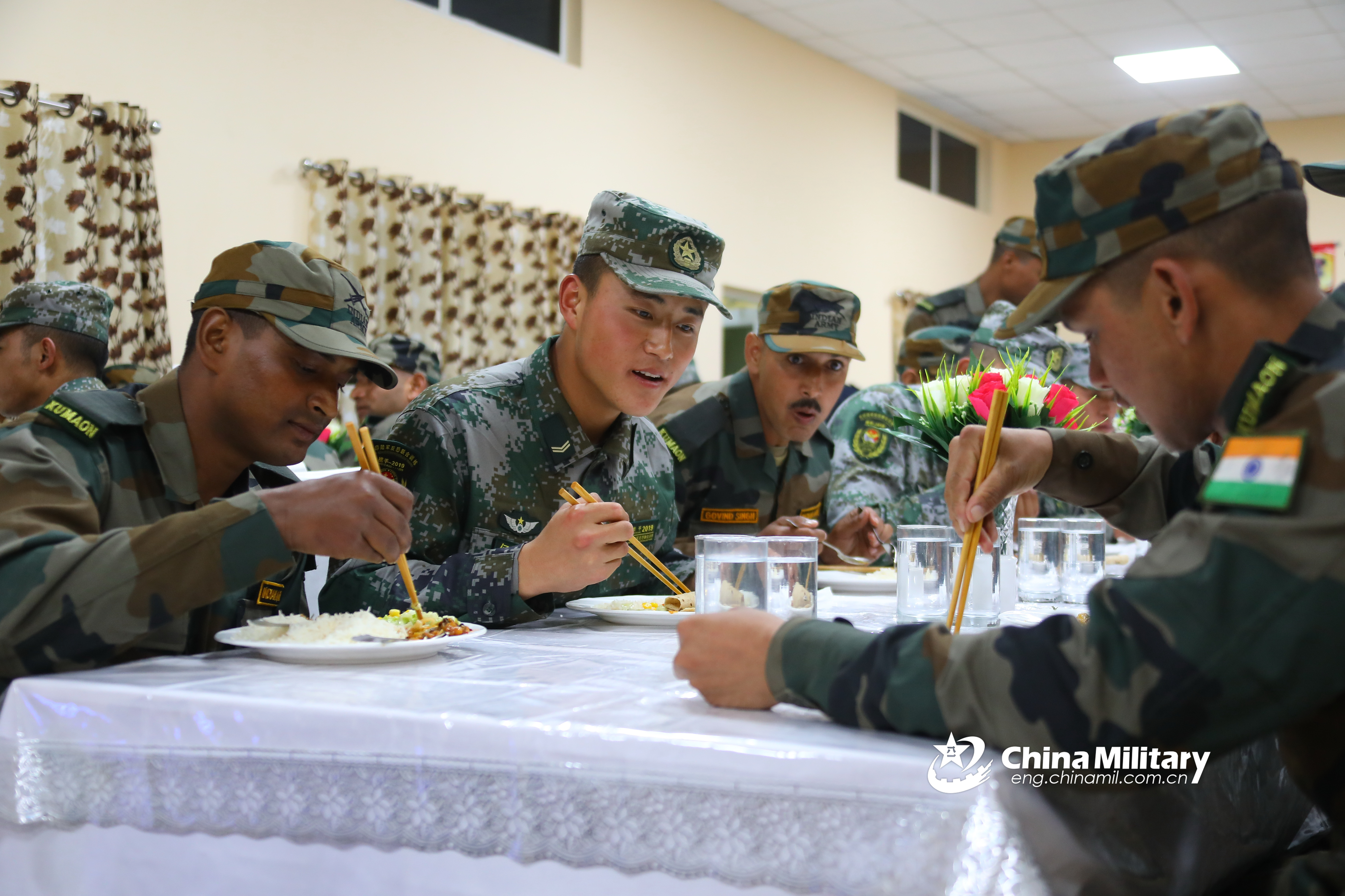 A Chinese soldier teaches his Indian peers how to pick up food with chopsticks during the dinner on December 11, 2019. The 8th China-India "Hand-in-Hand 2019" Joint Counter-terrorism Exercise kicked off at Umroi Cantonment in India on Dec. 7, 2019. Each military has dispatched 130 service members to take part in the 16-day exercise and the Chinese participating troops are from the PLA Xizang Military Command. (eng.chinamil.com.cn/Photo by Wang Hao)