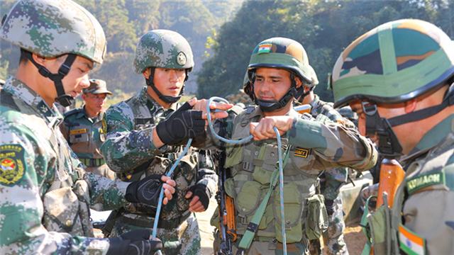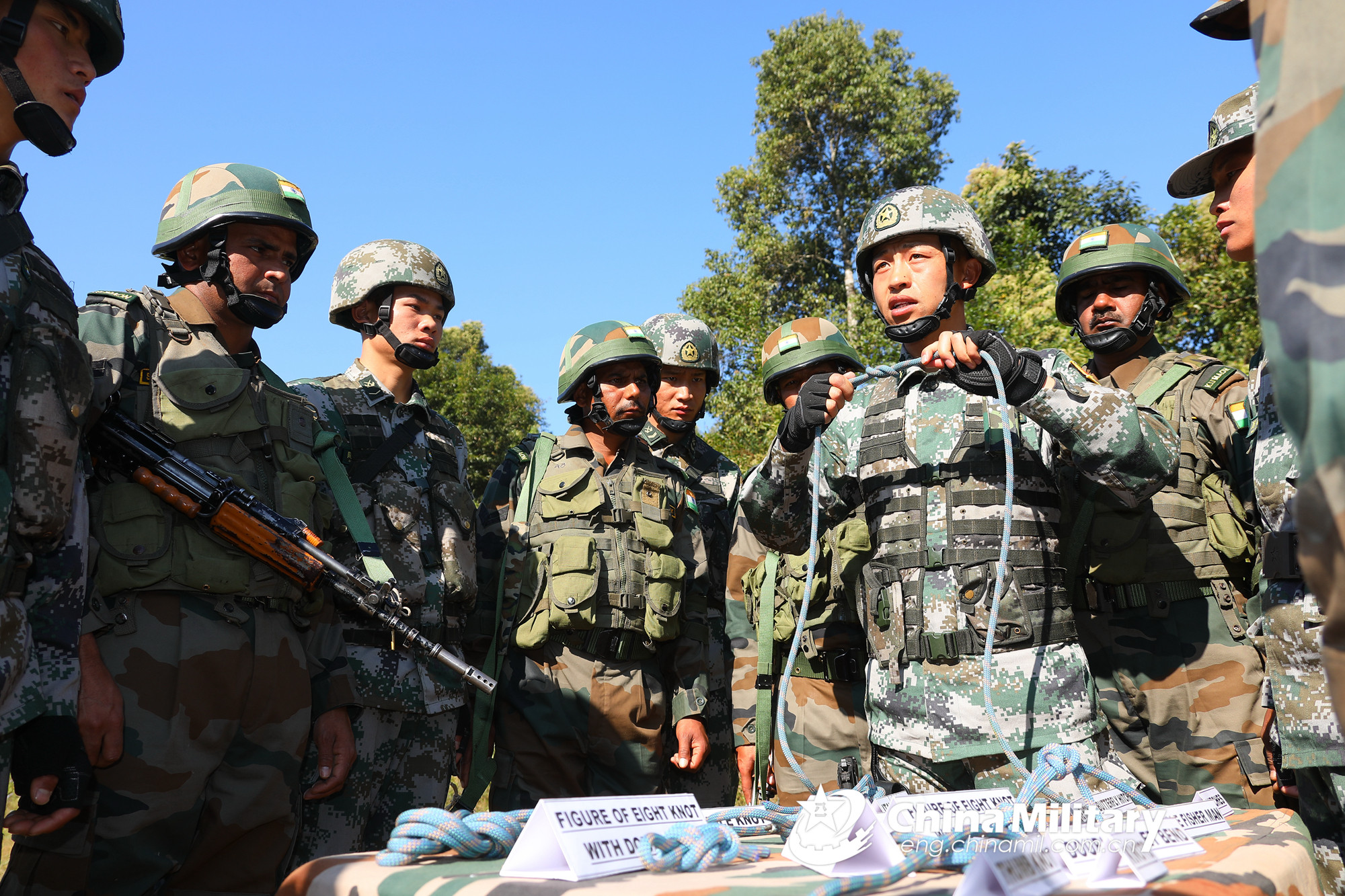 Chinese and Indian soldiers exchange on how to tie a square knot prior to a cliff-climbing training exercise at Umroi Cantonment, capital city of Meghalaya in northeast India, on December 14, 2019. The 8th China-India "Hand-in-Hand 2019" Joint Counter-terrorism Exercise kicked off on Dec. 7, 2019. The 16-day exercise, which consists of three phases of adaptation training, mixed training and comprehensive exercises, mixed Chinese and Indian troops into two groups to jointly conduct counter-terrorism tactical drills. (eng.chinamil.com.cn/Photo by Wang Hao)