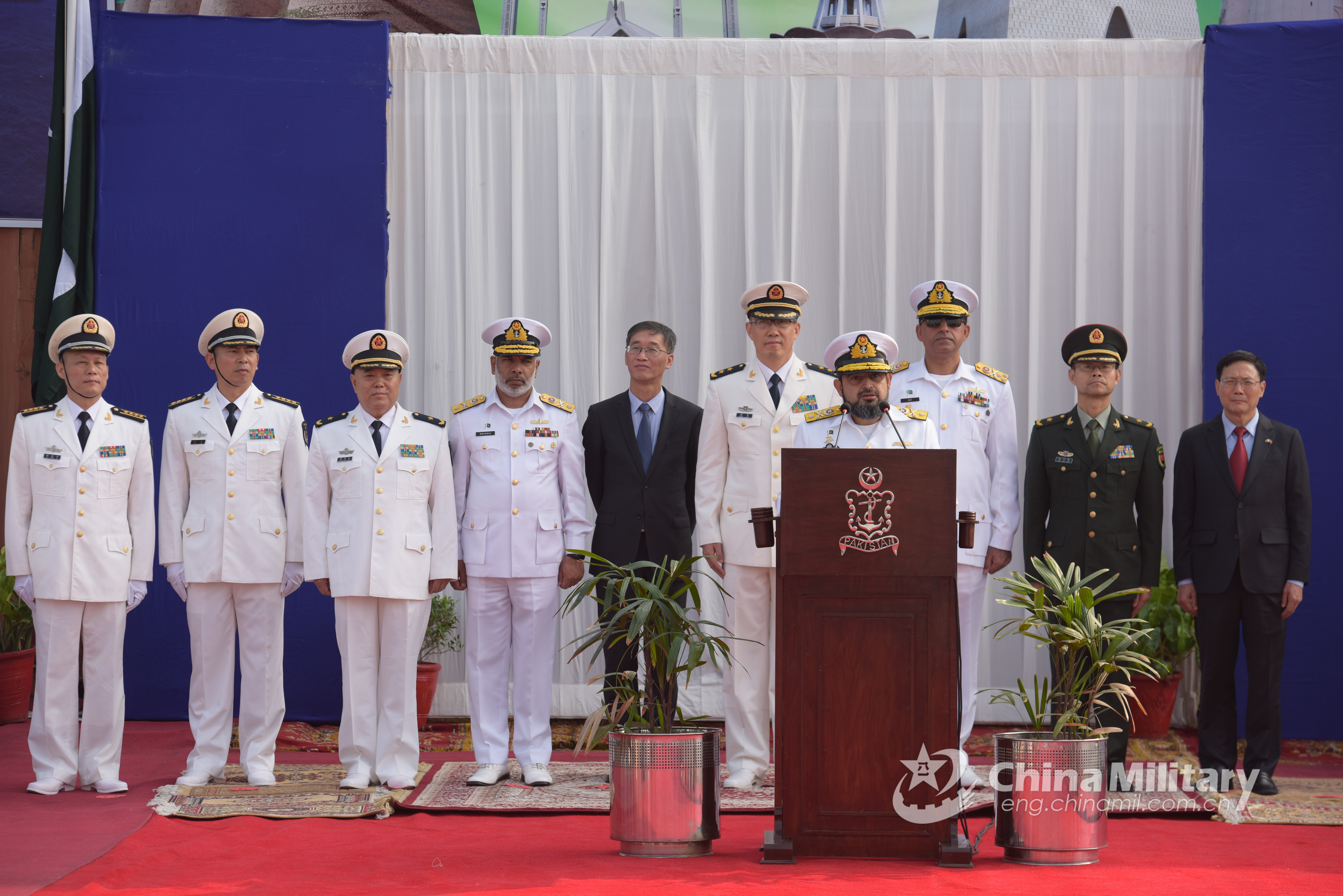 Commodore Zafar Iqbal, president of the Pakistan Navy Tactical School gives a speech at the the welcome ceremony for the arriving Chinese warships at the port of Karachi on January 5, 2020. The PN-PLAN Bilateral Exercise, code-named Sea Guardians-2020, kicked off at the Pakistan Navy Dock Yard in Karachi, Pakistan on the morning of January 6, local time. (eng.chinamil.com.cn/Photo by Dong Zhaohui)