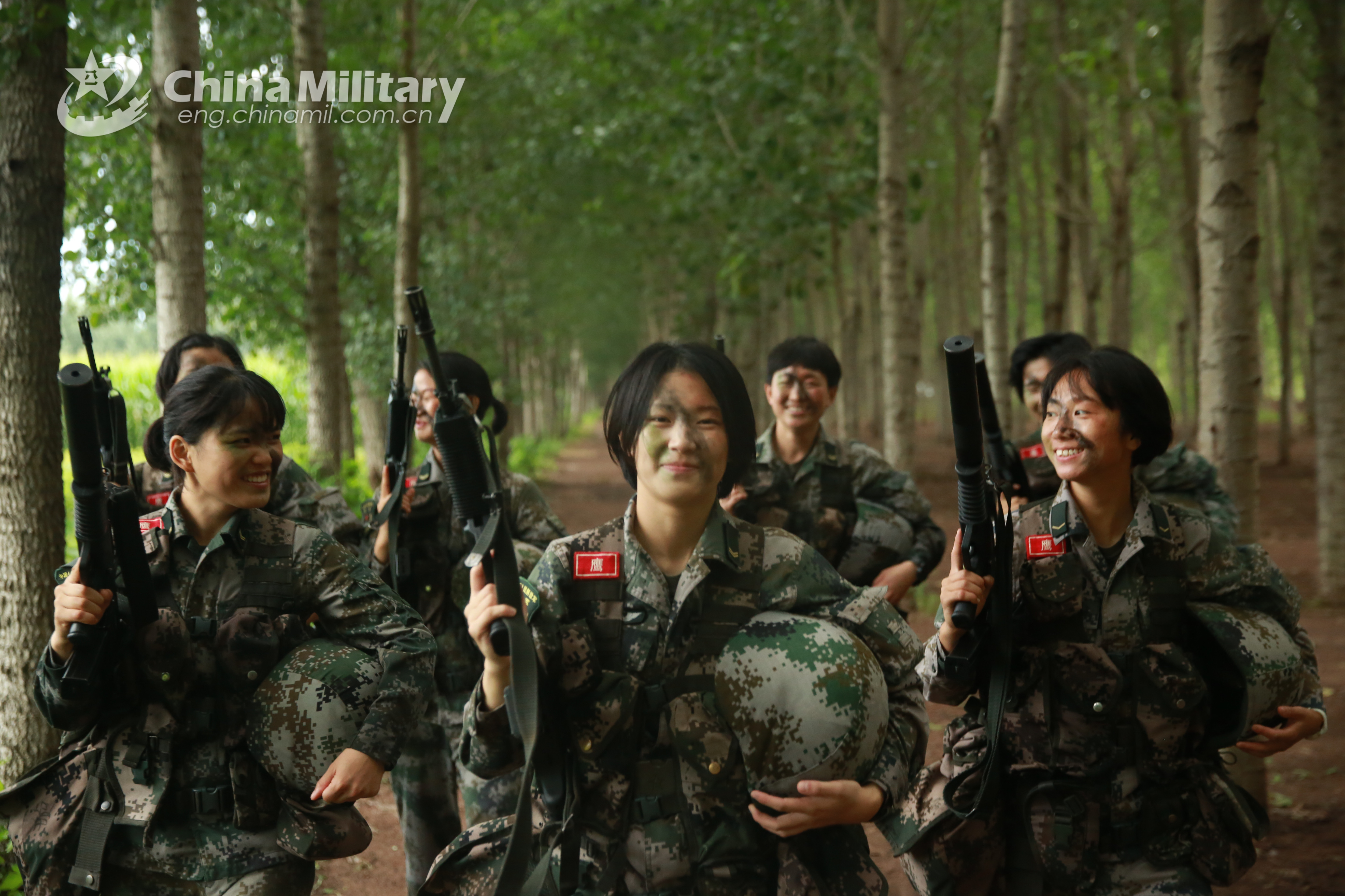Female soldiers safely accomplish multiple tasks and pose for a group photo with their rifles during a jungle tactical operation in mid August. Assigned to a brigade under the PLA 80th Group Army, they are participating in risky subjects including long-distance raid, camouflage reconnaissance, wildness survival and others. (eng.chinamil.com.cn/Photo by Zhang Deyi)