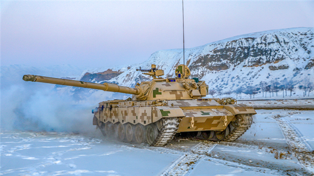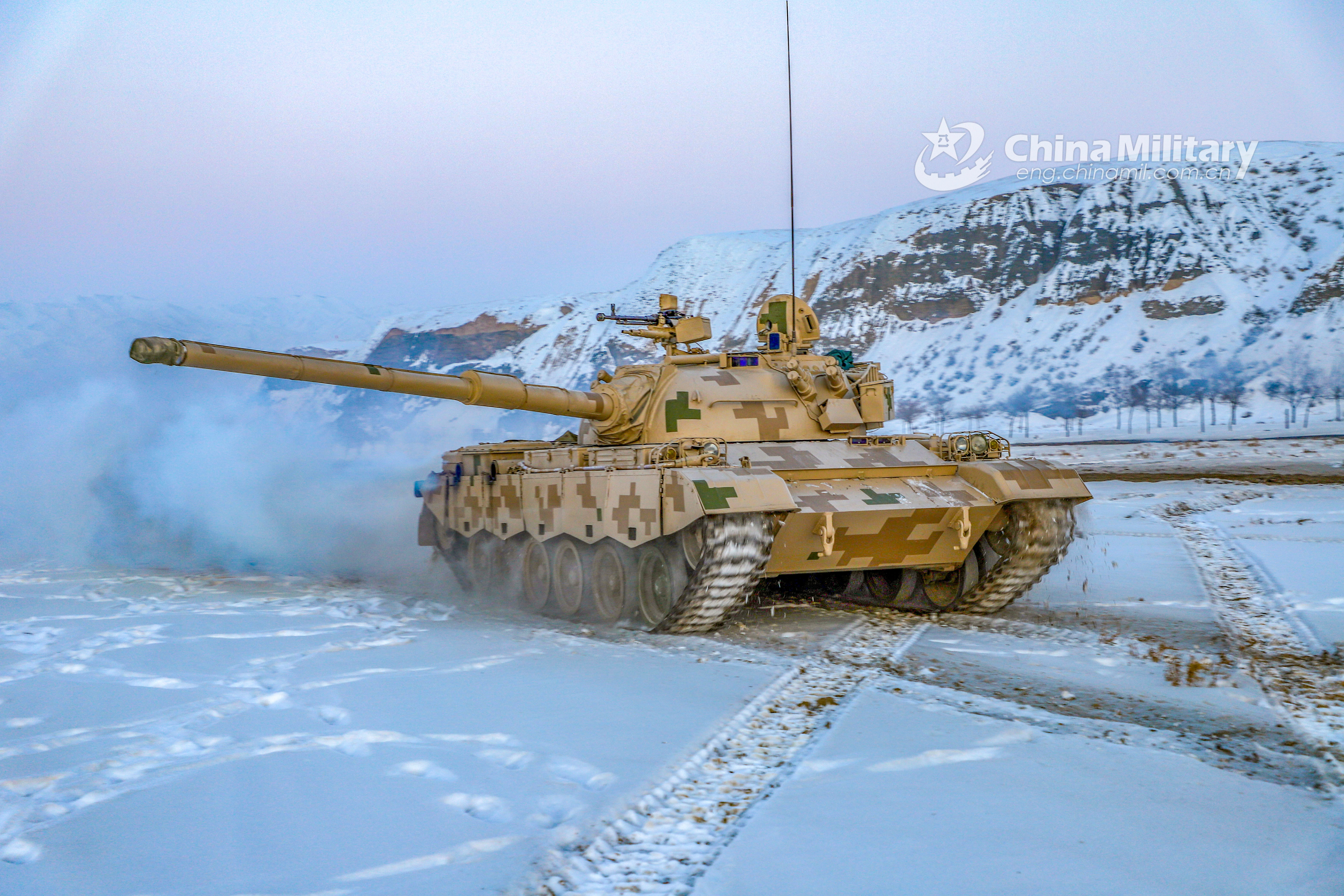 A main battle tank attached to a combined arms regiment under the PLA Xinjiang Military Command rumbles on the snow as it searches targets during a realistic training exercise in the severe cold weather on December 8. 2020. (eng.chinamil.com.cn/Photo by Hu Wenbo)