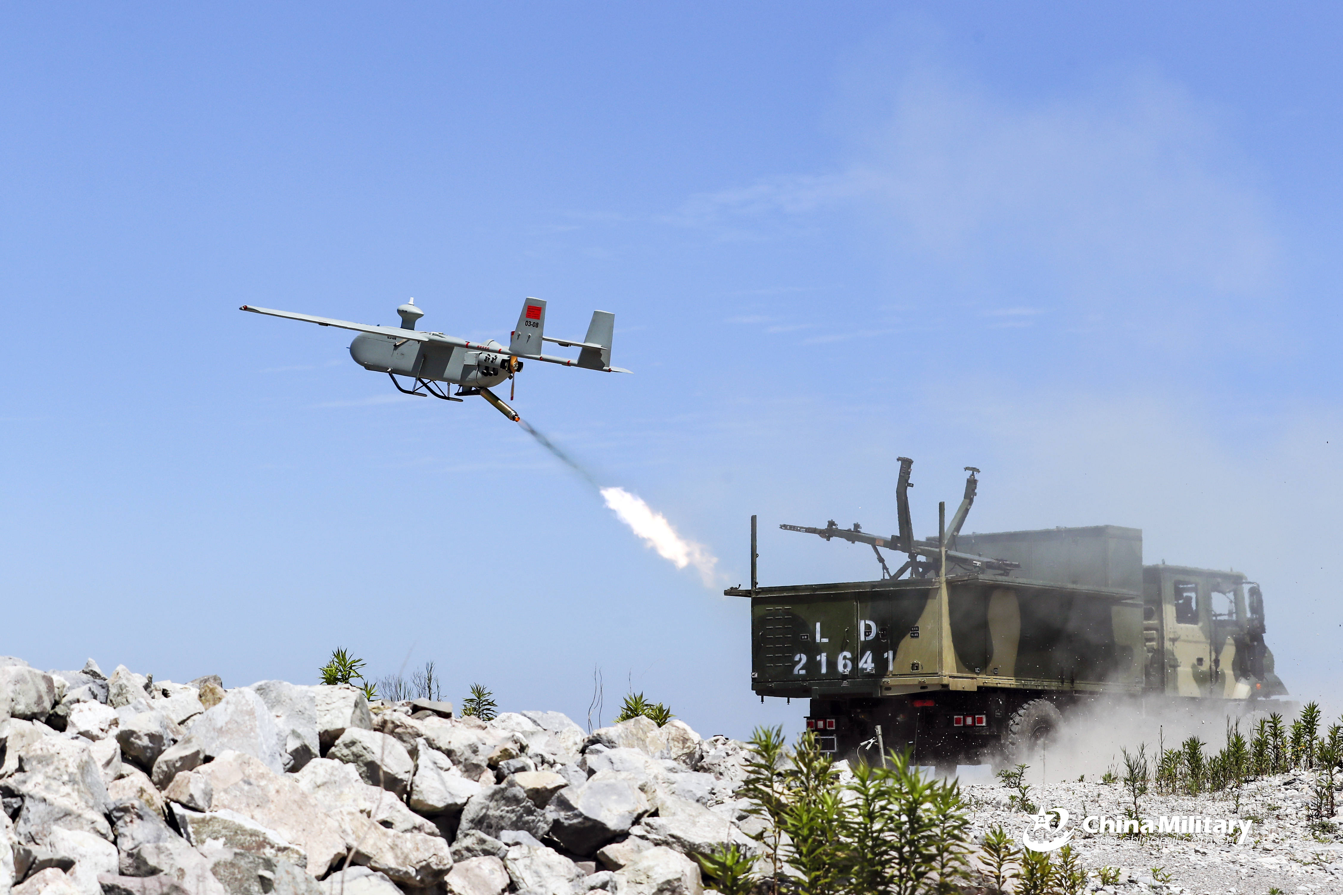An unmanned aerial vehicle (UAV) is launched for a flight training exercise conducted by an artillery brigade under the PLA 71st Group Army on May 31, 2021. (eng.chinamil.com.cn/Photo by Wu Zhaobing)