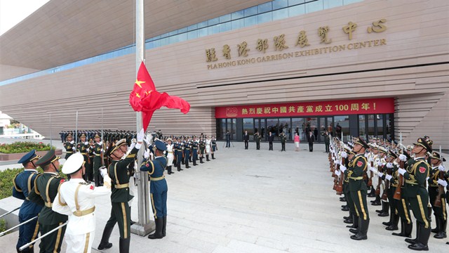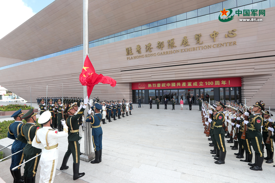 A national flag-raising ceremony is held before the opening ceremony of the exhibition center of the Chinese People's Liberation Army (PLA) Garrison in the Hong Kong Special Administrative Region (HKSAR) at the Ngong Shuen Chau Barracks in Hong Kong, south China on July 8, 2021. (eng.chinamil.com.cn/Photo by Yi Ding)