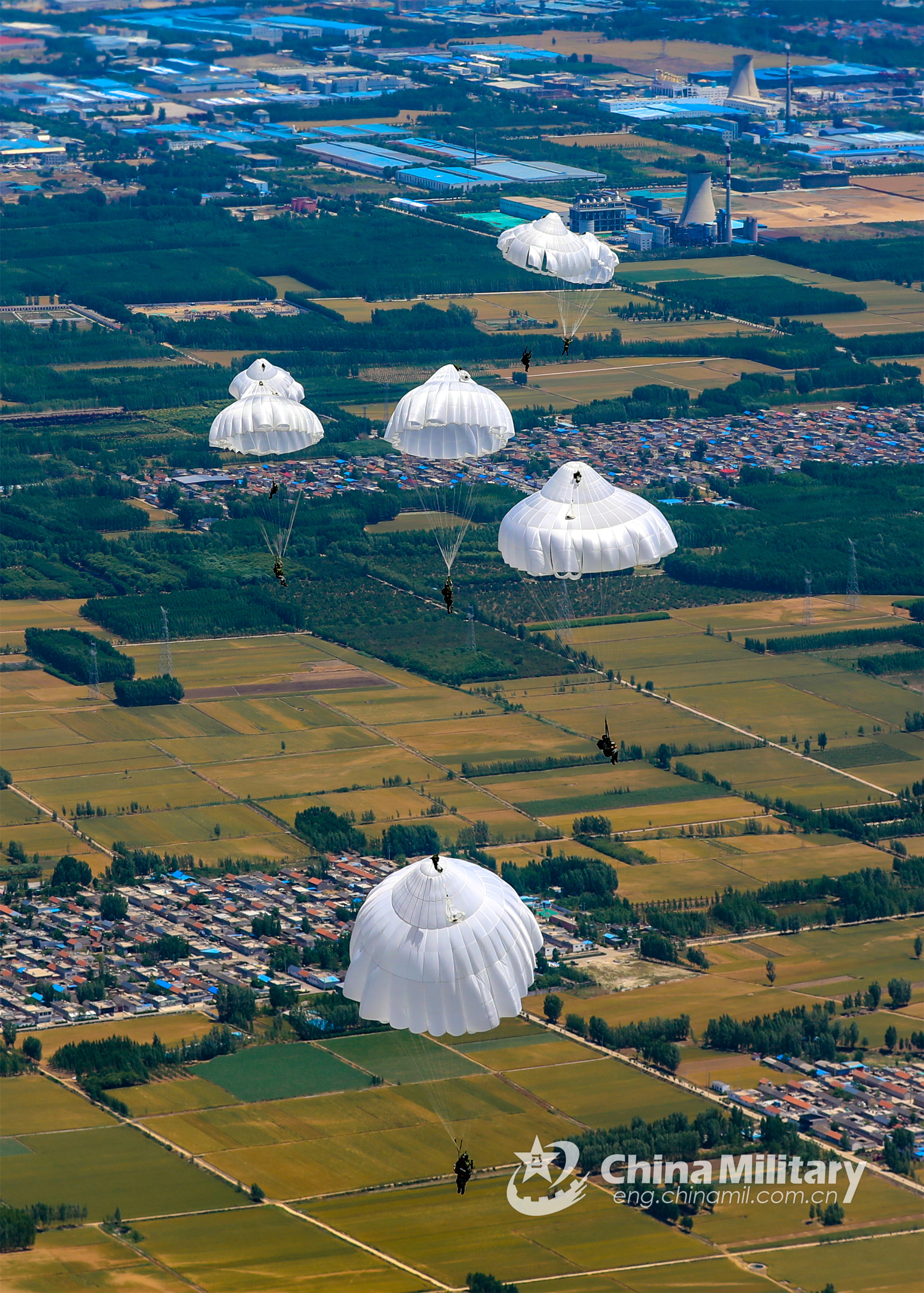 Special operations soldiers assigned to an army aviation brigade under the PLA 80th Group Army descend to the drop zones with their parachutes after jumping out of a Z-8 transport helicopter during a force projection operation on May 30, 2022. (eng.chinamil.com.cn/Photo by Gu Linfei)