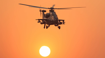 An attack helicopter attached to an army aviation brigadeunder the PLA 72nd Group Army flies at sunset during a round-the-clock flight training exercise in late February, 2023. (eng.chinamil.com.cn/Photo by Zhang Huanpeng)