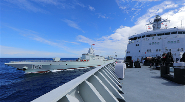 The comprehensive supply ship Chaganhu (Hull 967) and the guided-missile frigate Yuncheng (Hull 571) attached to a unit with the navy under the PLA Southern Theater Command conduct alongside replenishment-at-sea during a maritime training exercise on July 25, 2024. (eng.chinamil.com.cn/Photo by Peng Jun)