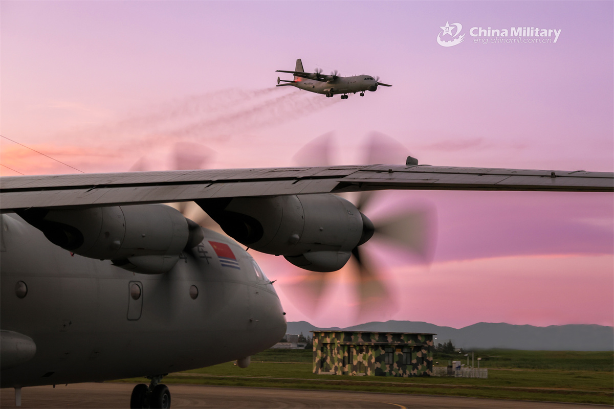 Y-9 transport aircraft attached to an aviation regiment with the navy under the Chinese PLA Eastern Theater Command take off in succession during a day-and-night flight training exercise on August 21, 2025. (eng.chinamil.com.cn/Photo by Wang Haojing)