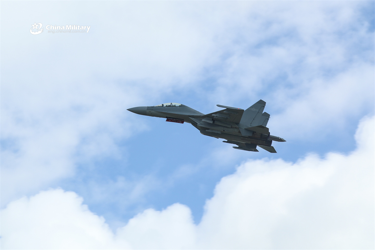 A J-16 fighter jet attached to unit with the air force under the Chinese PLA Eastern Theater Command flies towards the designated airspace during a flight training exercise. (eng.chinamil.com.cn/Photo by Li Kai)