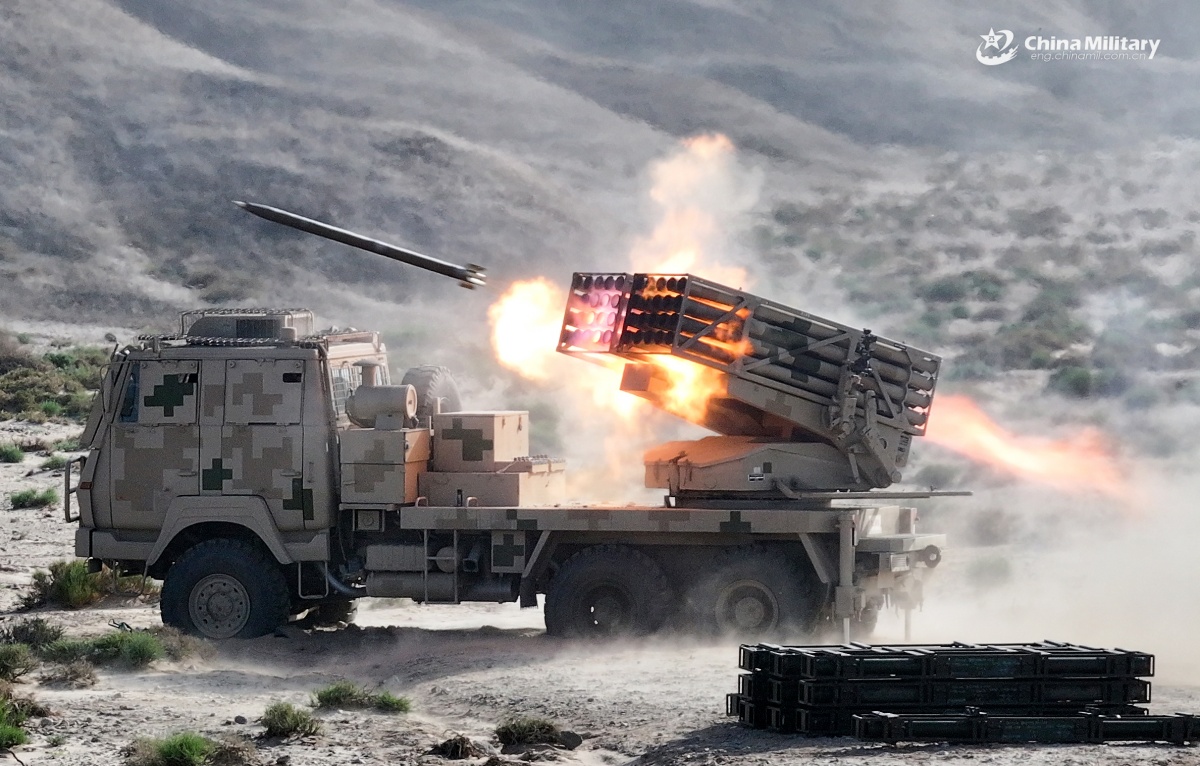 A PHL-11 122mm wheeled multiple launch rocket system (MLRS) attached to an artillery element of a brigade under the Chinese PLA 77th Group Army opens fire during a live-fire shooting assessment in late September, 2025. (eng.chinamil.com.cn/Photo by Ding Kai)