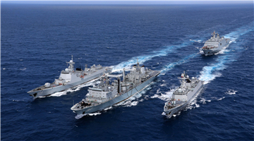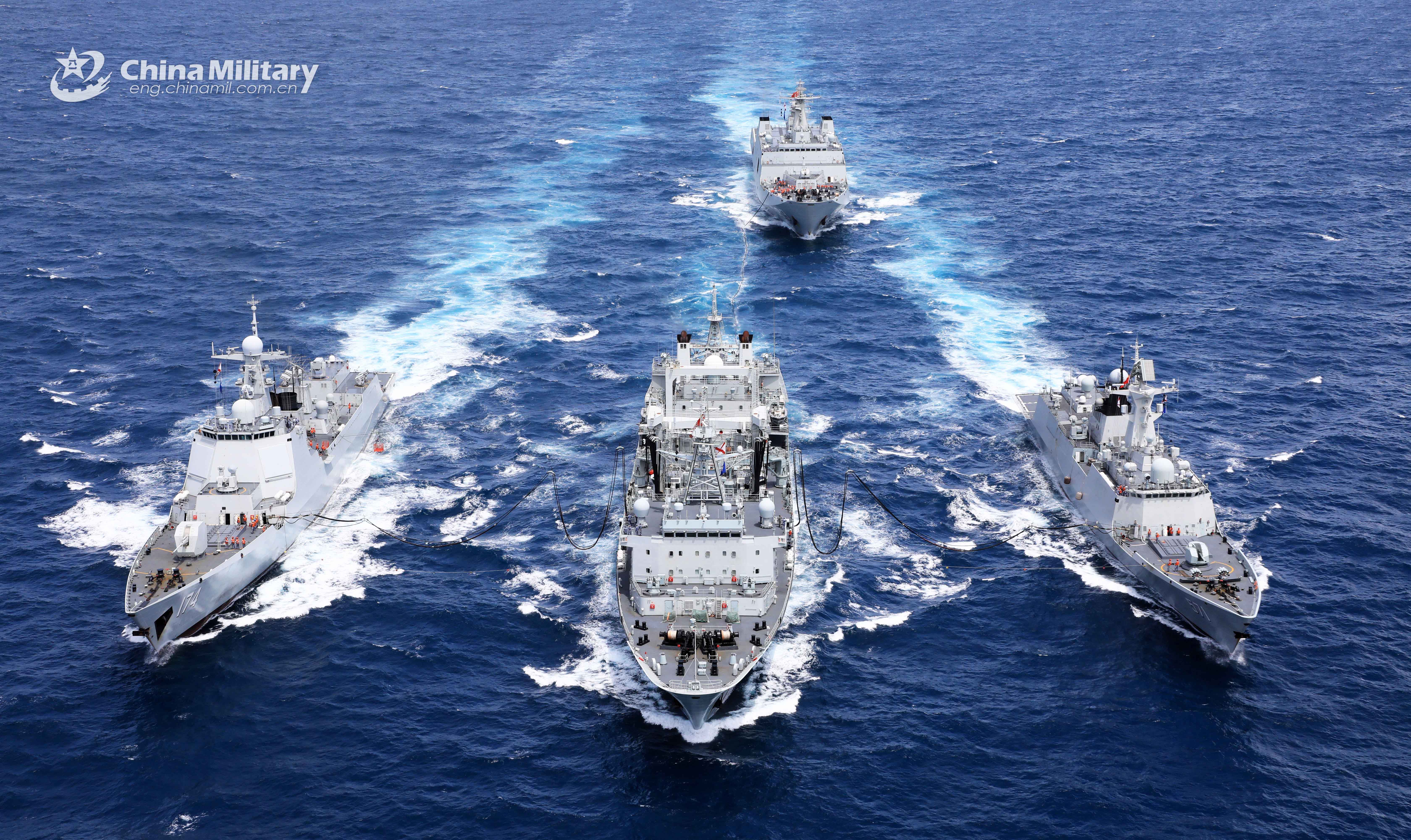 Naval ships attached to a far-sea joint training flotilla with the navy under the PLA Southern Theater Command conduct alongside and astern replenishment-at-sea during a maritime training exercise in waters of the Pacific Ocean on Feb. 7, 2019. The comprehensive supply ship Honghu (Hull 963) transferred solid and liquid cargoes simultaneously to the guided-missile destroyer Hefei (Hull 174), the guided-missile frigate Yuncheng (Hull 571), and the amphibious transport dock Changbaishan (Hull 989) during the replenishment-at-sea. (eng.chinamil.com.cn/Photo by Zhou Qiqing)