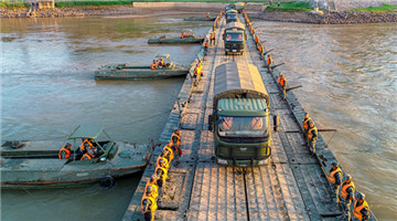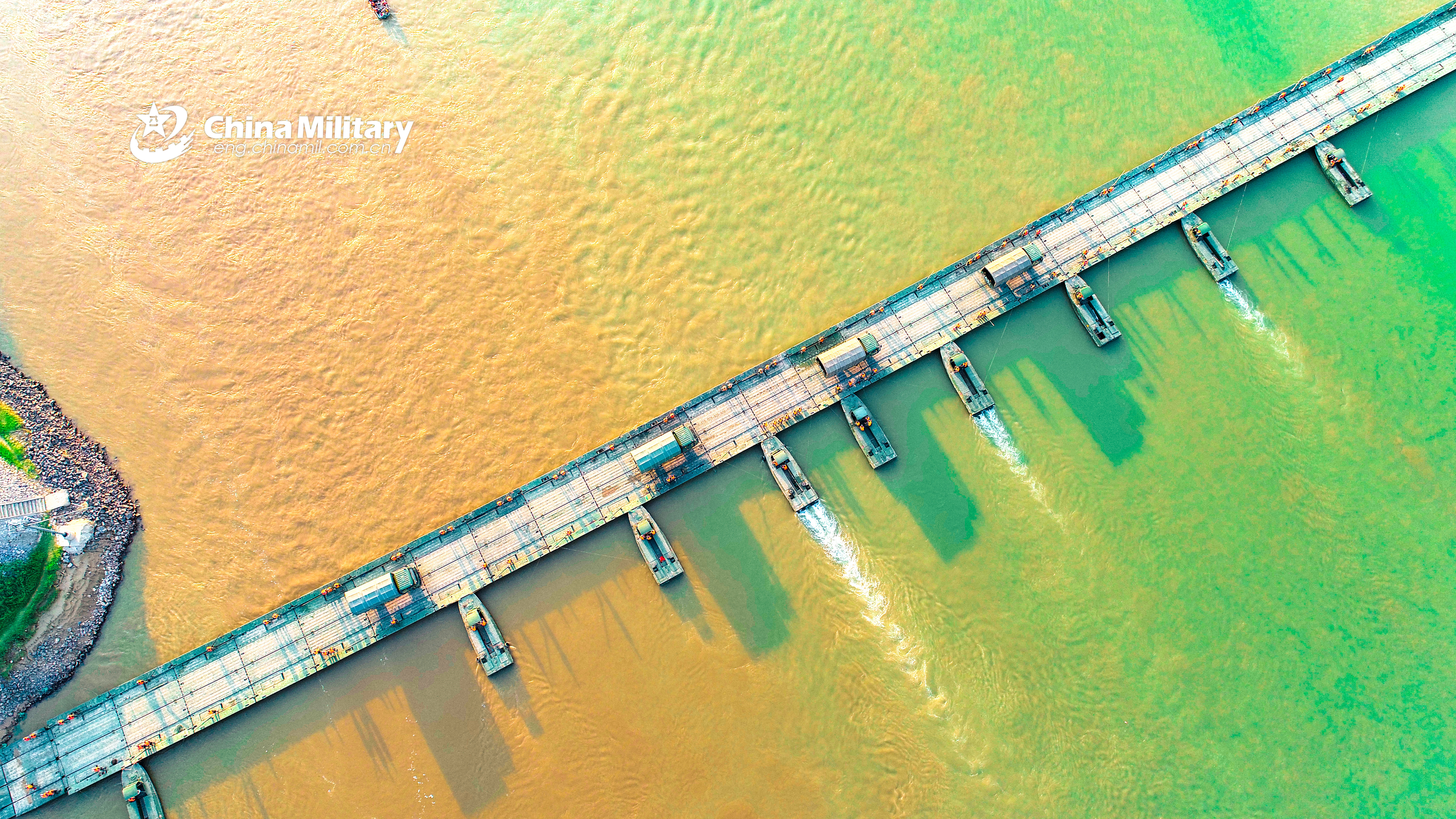 Aerial view of a completed floating pontoon bridge across the the midstream Yellow River, which was assembled by soldiers assigned to a brigade under the PLA 82nd Group Army during a field training exercise from August 13 to 15, 2019. (eng.chinamil.com.cn/Photo by Wan Ruiwu)