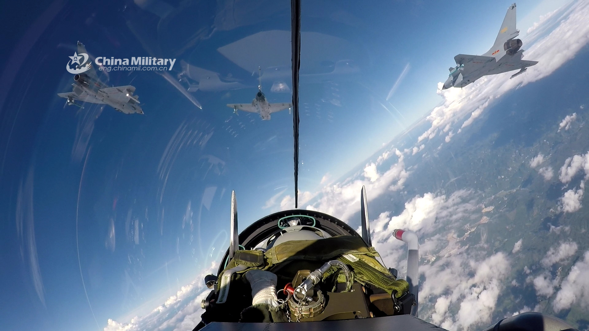 Fighter jets attached to an aviation brigade of the air force under the PLA Southern Theater Command soar over the sky in tactical formation during a coordinated flight training exercise on August 29, 2019. (eng.chinamil.com.cn/Photo by Gu Haodong and Tian Feng)