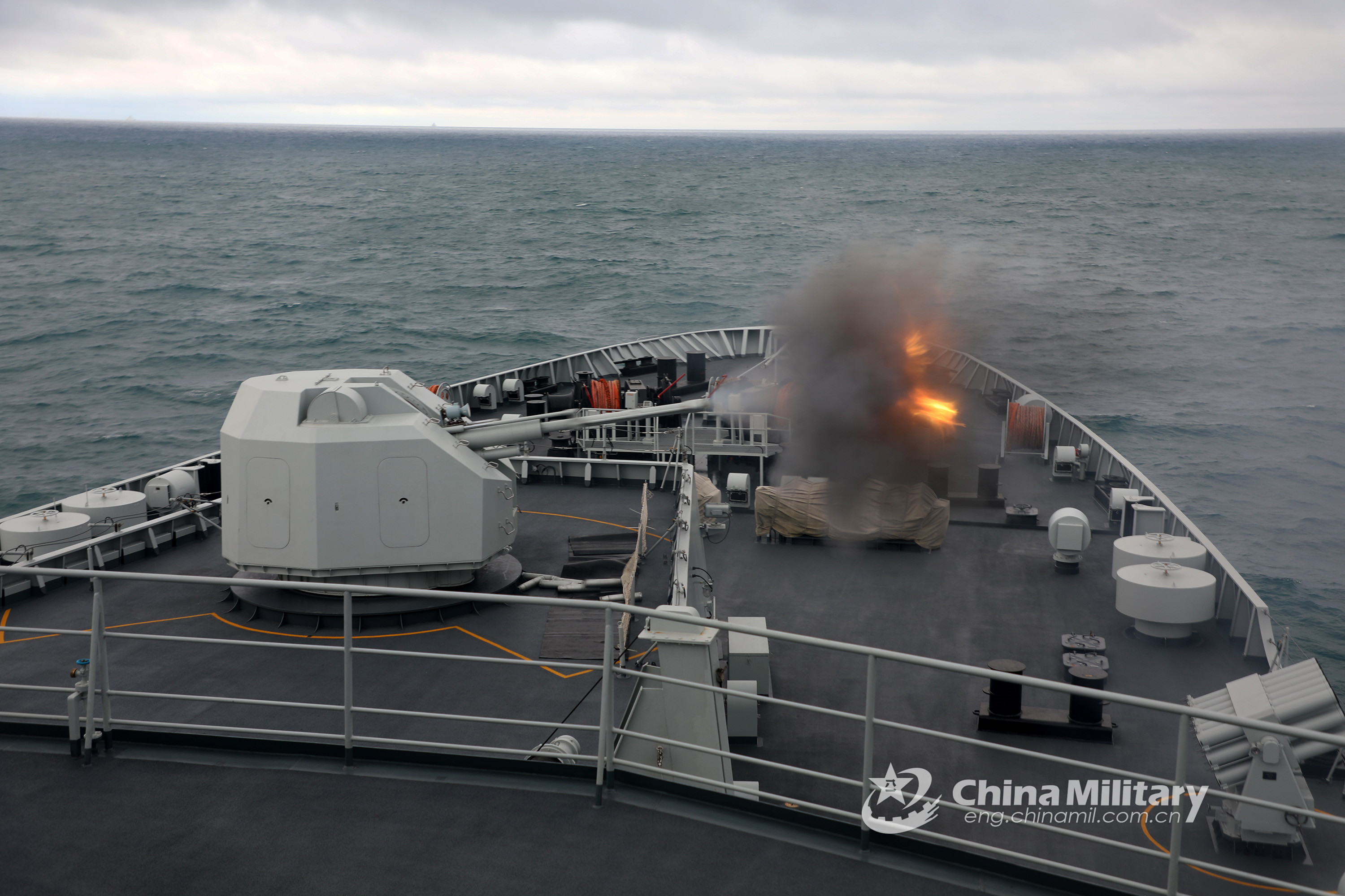 The amphibious dock landing ship Wuzhishan (Hull 987) attached to a landing ship flotilla with the navy under the PLA Southern Theater Command fires its main gun against ashore targets during the 3-day maritime live-fire training in waters of the South China Sea from December 29 to 31, 2019. (eng.chinamil.com.cn/Photo by Zhang Sutong and Gu Yagen)