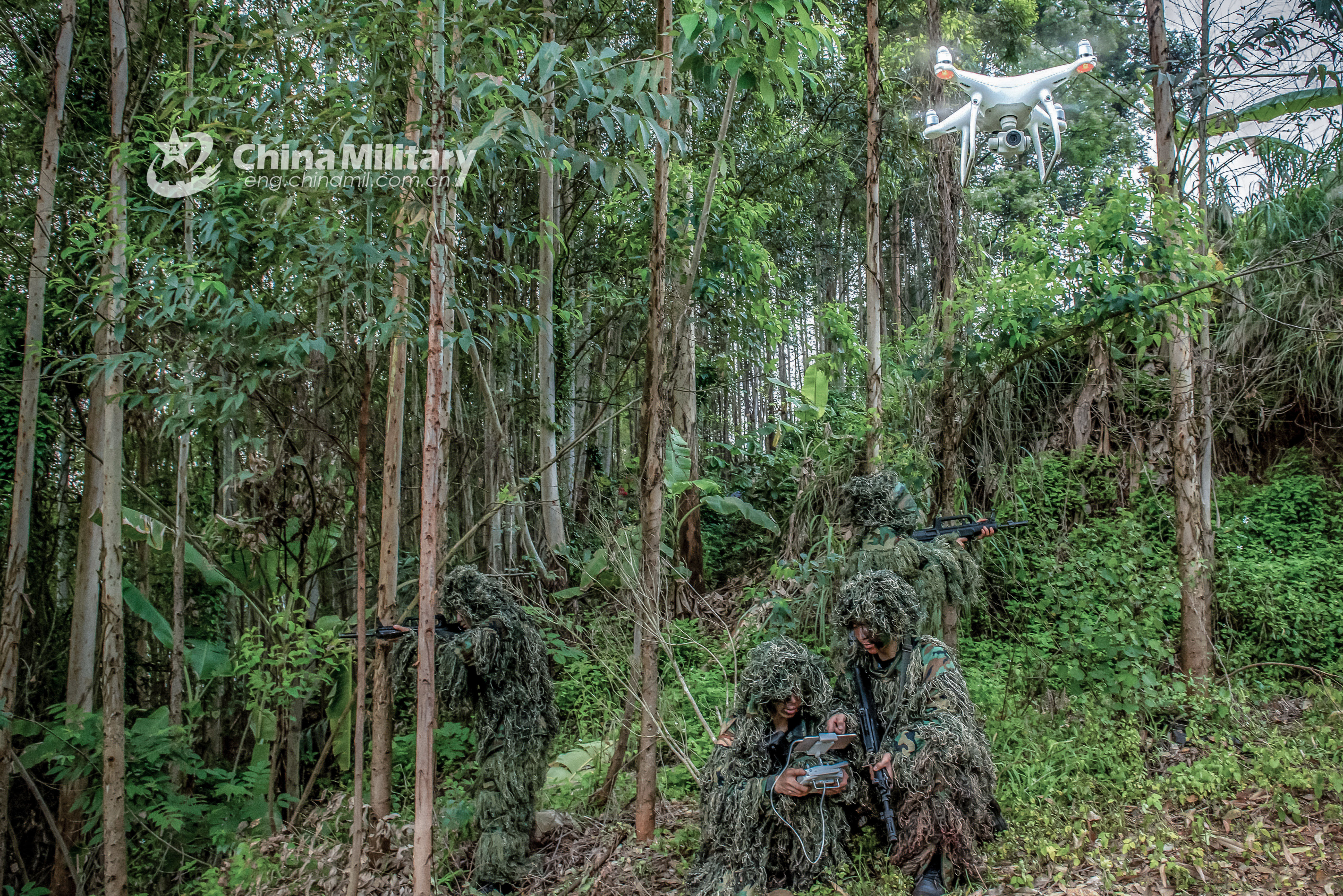 Special operations soldiers wearing ghillie suits practice observation tactics using cover and concealment skills during a reconnaissance tactical training exercise in the woods on April 10, 2020. They are assigned to a mobile detachment under the People’s Armed Police (PAP) Force in South China's Guangxi Zhuang Autonomous Region. (eng.chinamil.com.cn/Photo by Yu Haiyang)