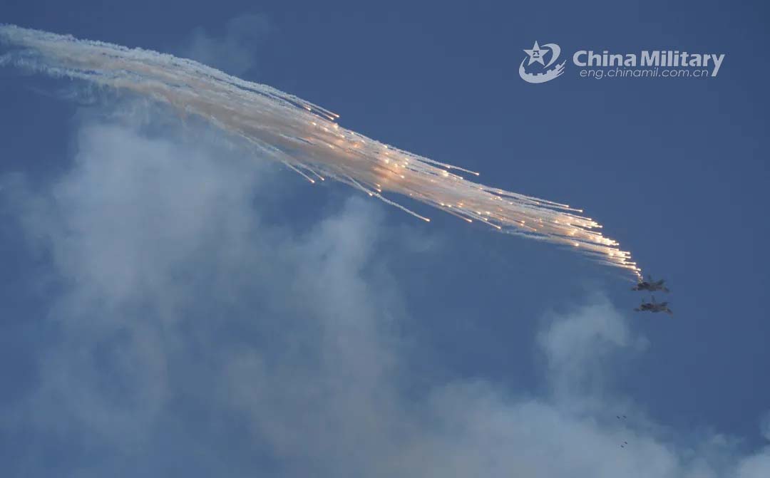 Fighter jets roar into the sky and release jamming shells in the China-Russia joint military exercise ZAPAD/INTERACTION-2021 at a training base of the PLA Army in Qingtongxia City of northwest China's Ningxia Hui Autonomous Region from August 9 to 13, 2021. (eng.chinamil.com.cn/Photo by Wang Weidong)