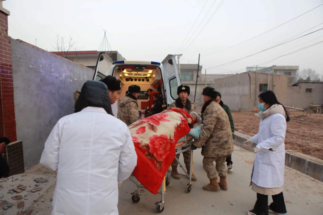 A brigade of the PLA 76th Group Army dispatched more than 300 service members who arrived at Chenjia Village and Liugou Town at around 4 am on December 19 to perform search and rescue, road repair, material transportation and other tasks.