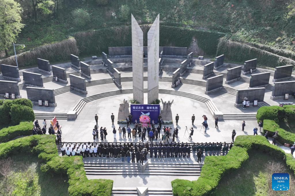 An aerial drone photo taken on April 3, 2025 shows a ceremony honoring anti-Japanese aviation heroes at the Nanjing Memorial Cemetery to the Anti-Japanese Aviator Martyrs in Nanjing, east China's Jiangsu Province. China on Thursday released its second revised list of Chinese aviation martyrs who sacrificed their lives during the Chinese People's War of Resistance Against Japanese Aggression, expanding it to 1,470 names, according to the Nanjing Anti-Japanese Aviation Martyrs Memorial Hall in east China's Jiangsu Province. (Xinhua/Mao Jun)