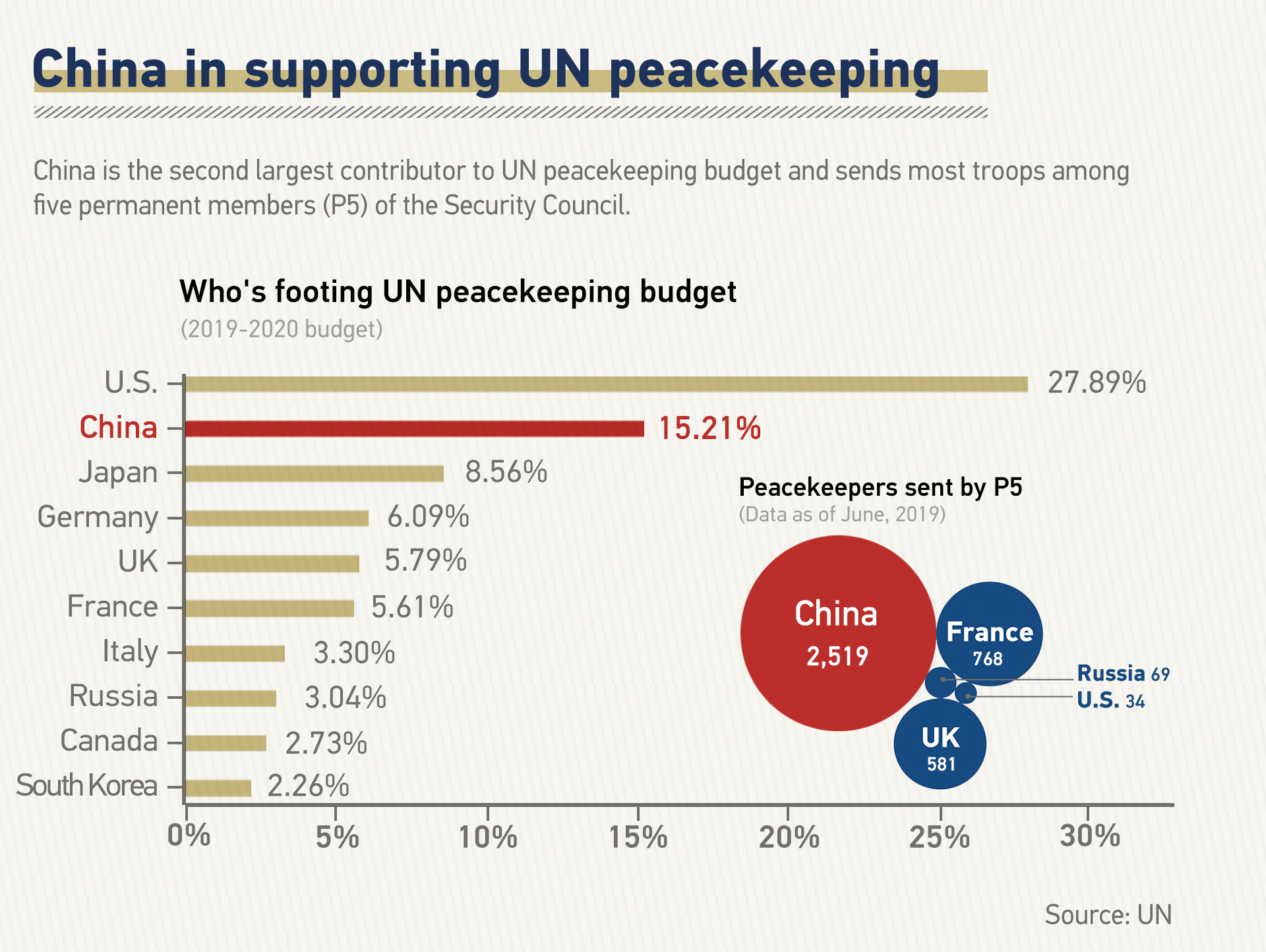 There will also be a formation of peacekeepers for the first time. China is the biggest contributor of peacekeepers among the five permanent members of the UN Security Council. More than 2,500 Chinese peace troops are safeguarding peace at the risk of their lives in the UN's seven peacekeeping mission areas.
