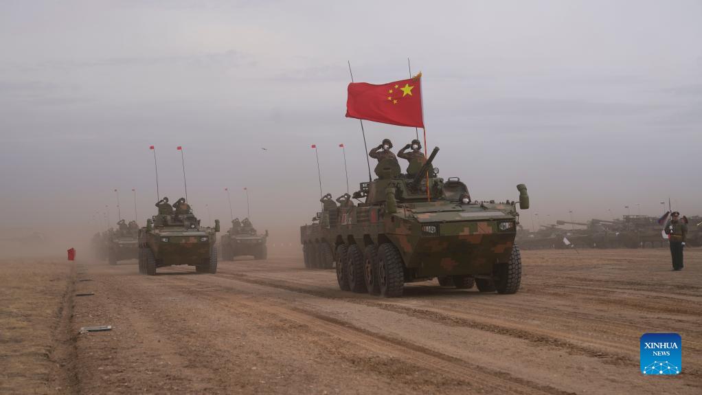Chinese troops participate in the closing ceremony of the "Peace Mission 2021" counter-terrorism military drill of the Shanghai Cooperation Organization (SCO) member states, at the Donguz training range in Russia's Orenburg Region on Sept. 24, 2021. The "Peace Mission 2021" counter-terrorism military drill of the Shanghai Cooperation Organization (SCO) member states wrapped up on Friday in Russia. (Xinhua/Mei Shixiong)